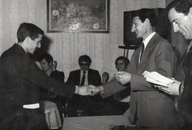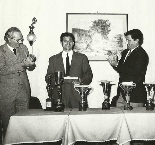 Invernizzi (al centro) festeggiato presso il Big Bar con l'intervento del vice sindaco Emilio Sangregorio (a sinistra)