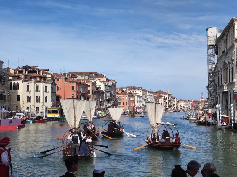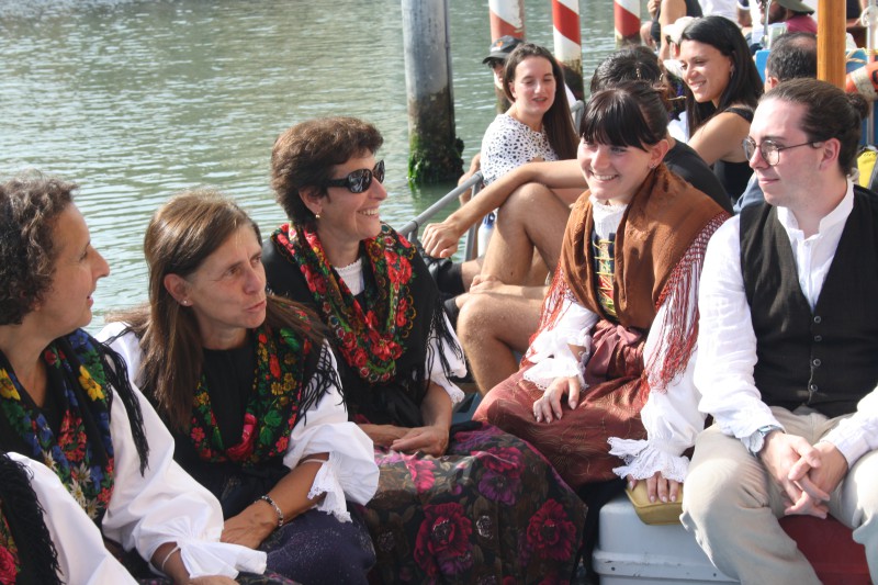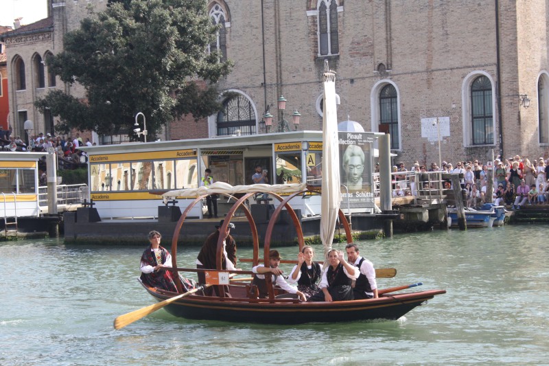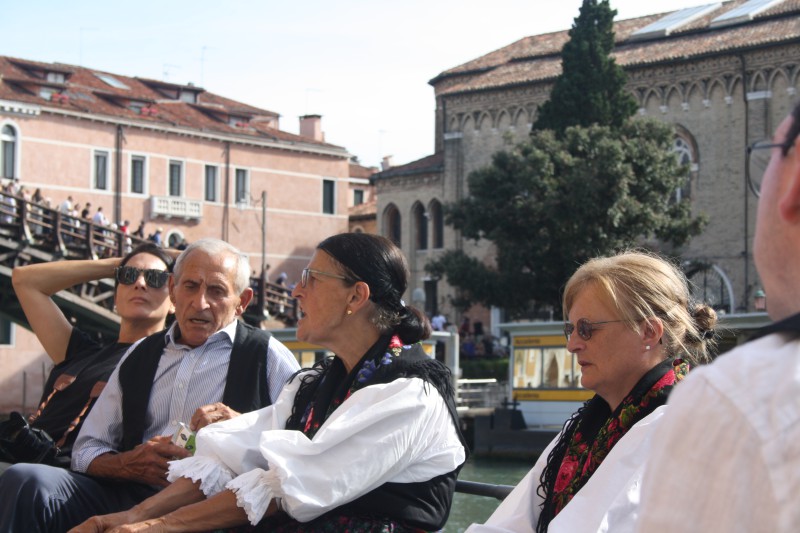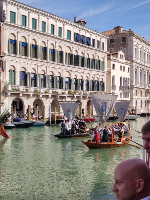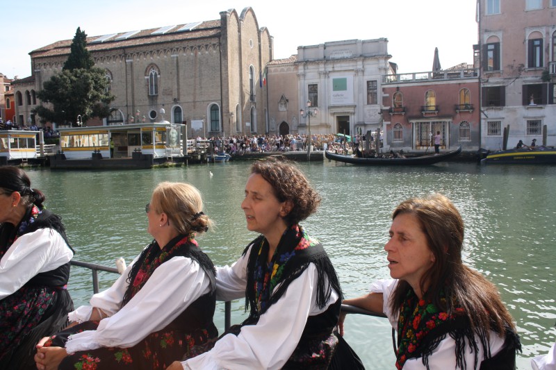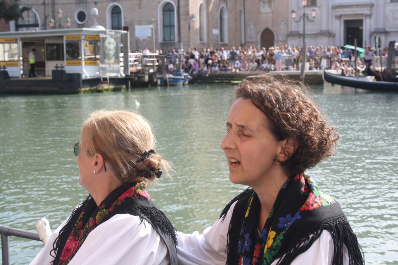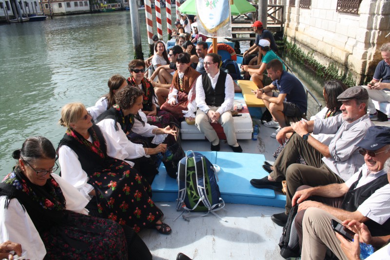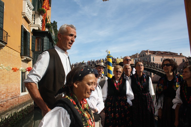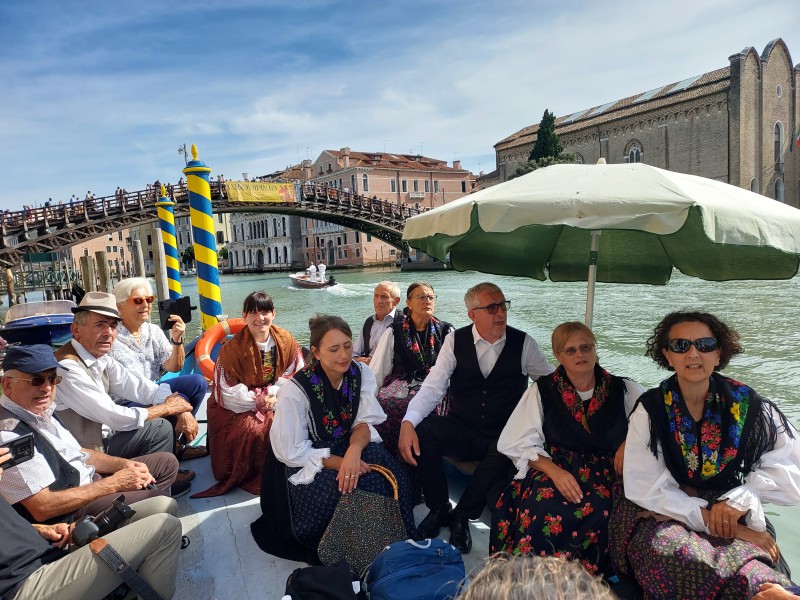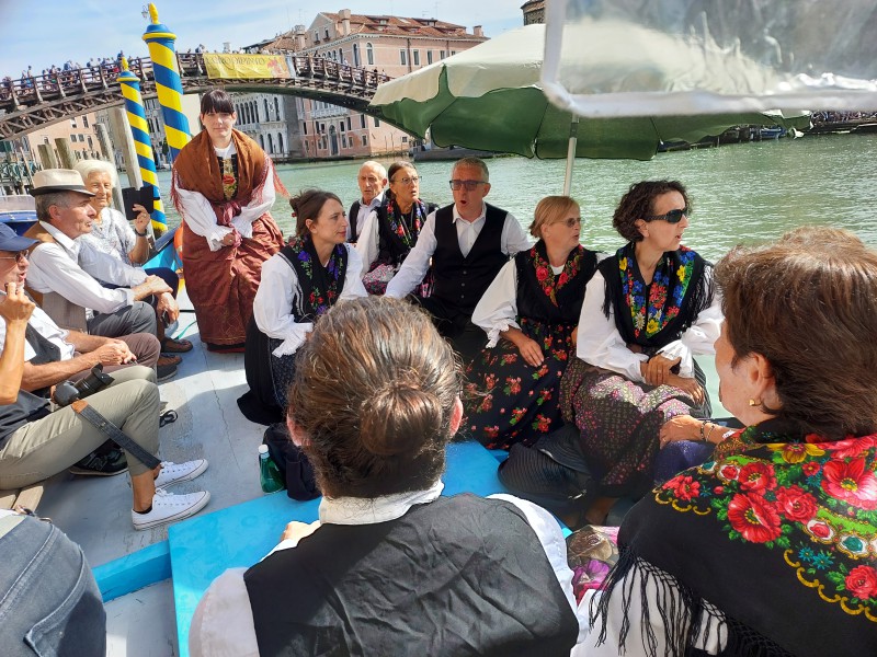 Dopo il pranzo in compagnia, il gruppo si è diviso in due: mentre una ventina di cantori, rigorosamente vestiti in abiti tradizionali, hanno preso parte nel Corteo Storico a bordo delle quattro “Lucie” messe a disposizione da A.B.I.L. (Associazione Barche in Legno Lecco APS) e condotte dai membri dell’A.S.D. Remiera I Laghèe di Bellano, i restanti membri del gruppo hanno assistito alla “sfilata” da terra, o meglio da un’imbarcazione ormeggiata lungo Canal Grande, nei pressi del Ponte dell’Accademia.