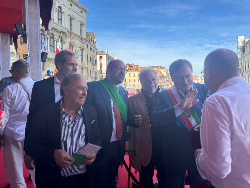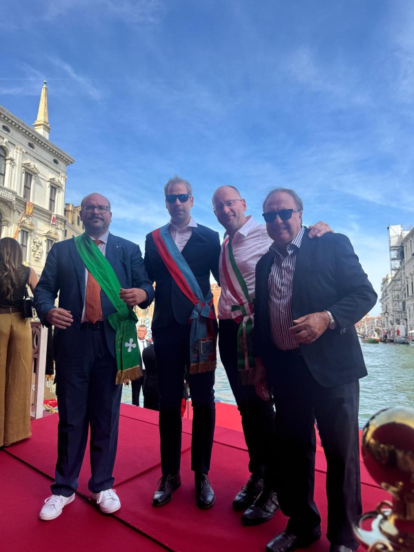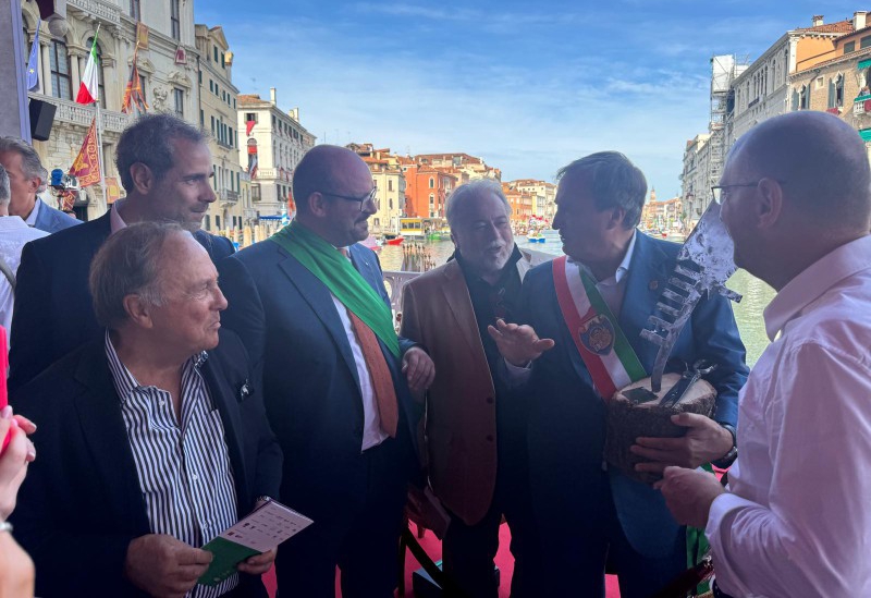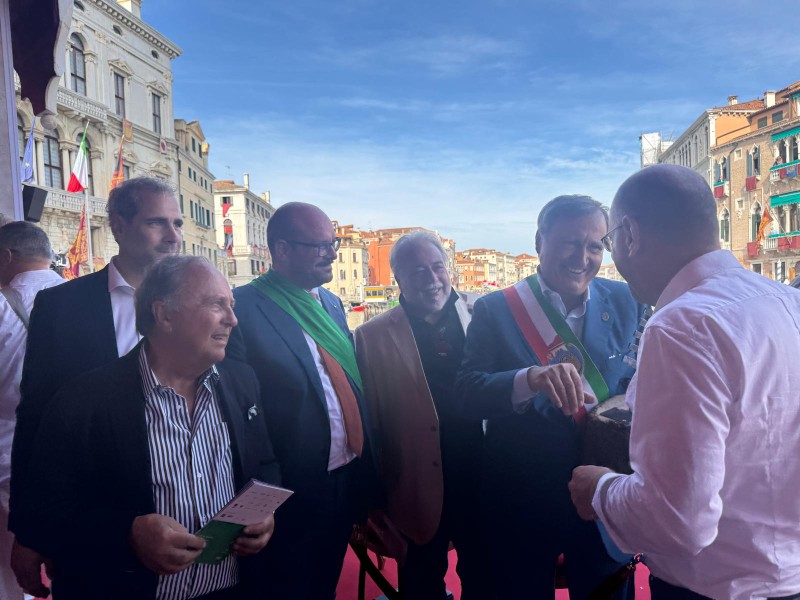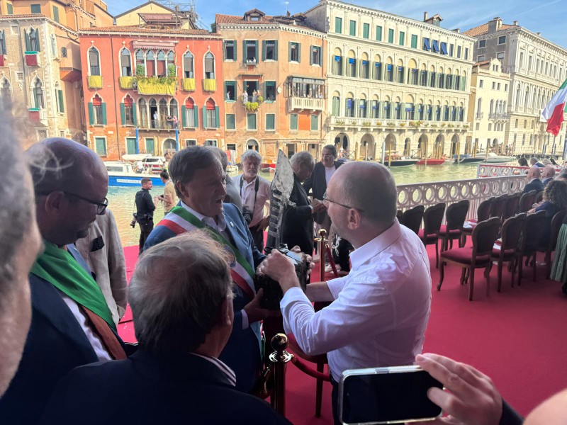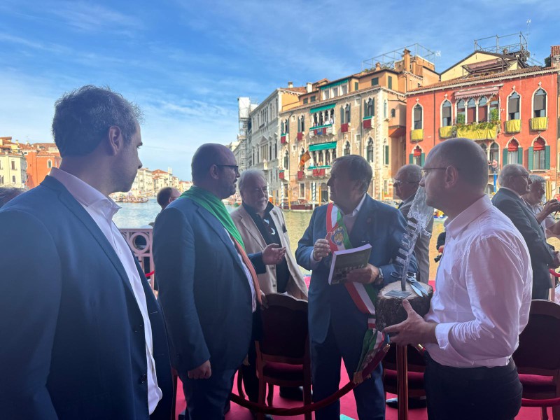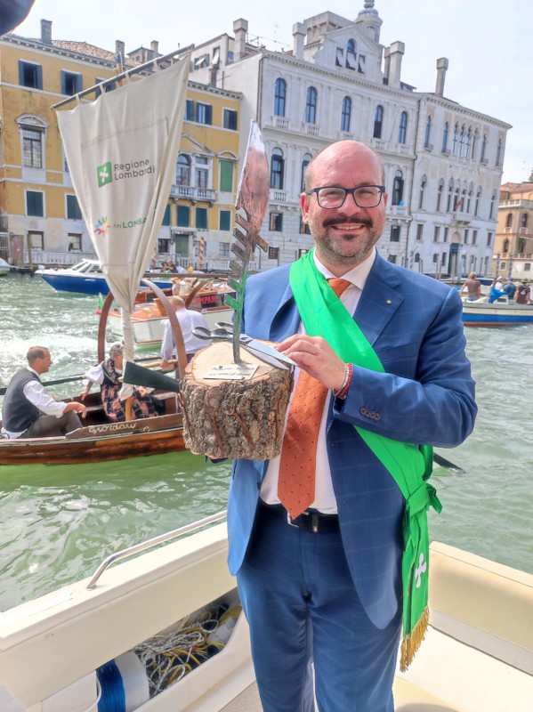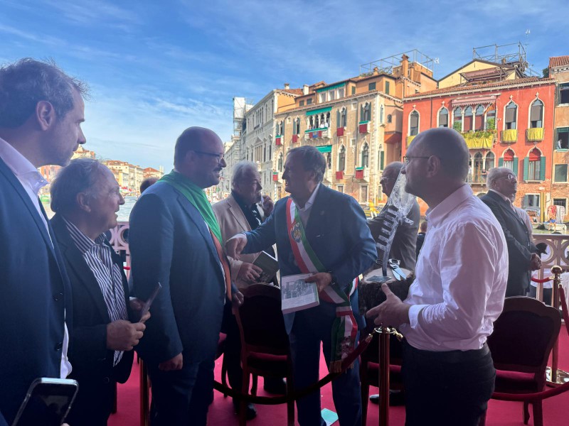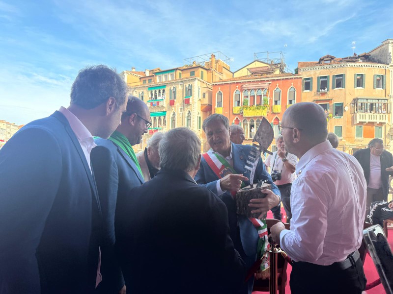 Manufatto consegnato personalmente dal vicesindaco Pomoni al primo cittadino di Venezia Luigi Brugnaro, alla presenza del consigliere regionale della Lombardia Giacomo Zamperini e del vicepresidente della Comunità Montana V.V.V.E.R. Michael Bonazzola.