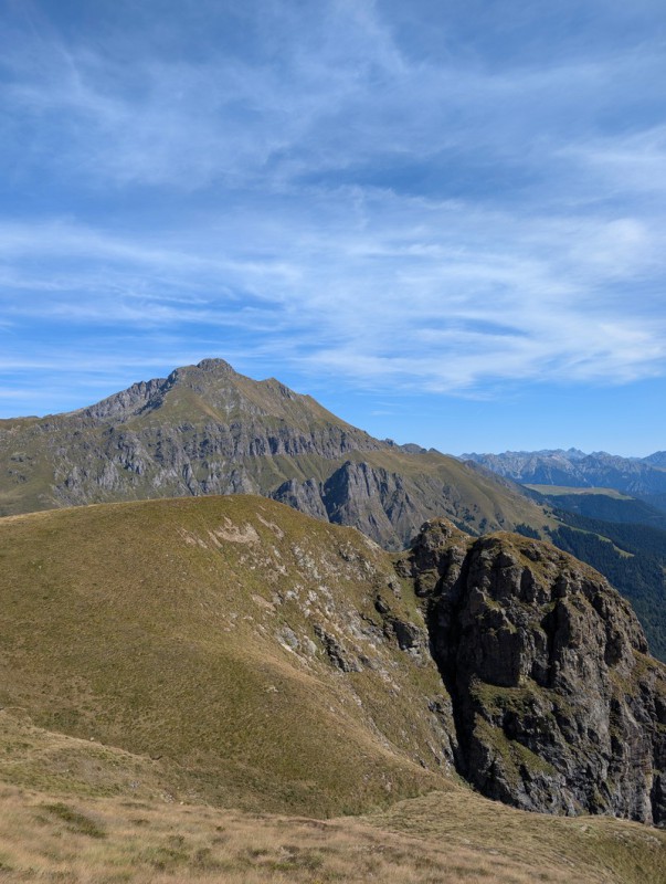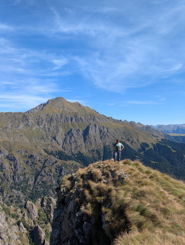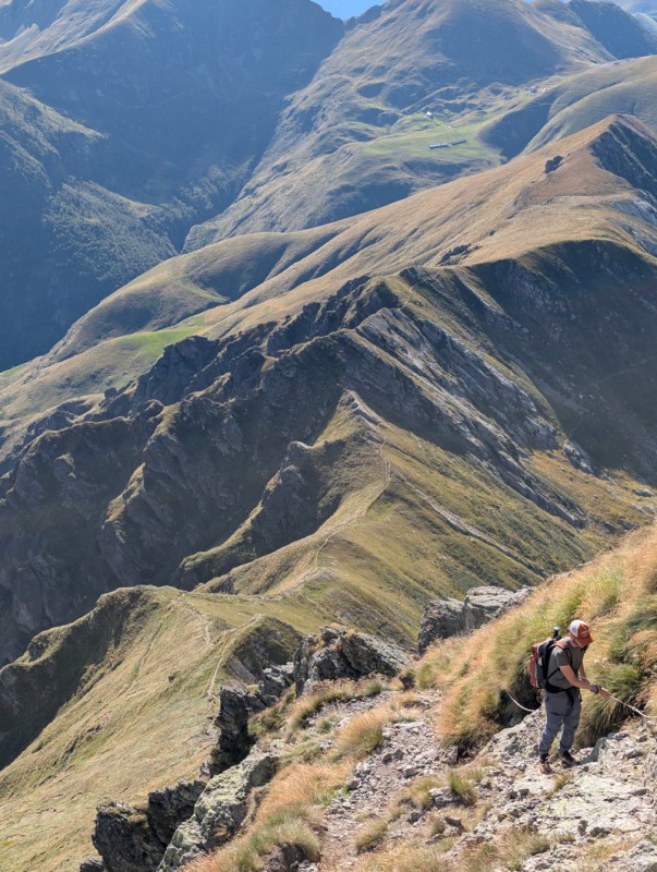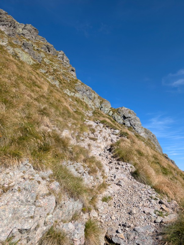 Inizia ora un breve tratto molto esposto, dove troviamo alcune catene di sicurezza. Dopo un primo tratto in discesa, superiamo uno spettacolare tratto di sentiero esposto sui due lati. Usciti da questa parte (molto panoramica), il peggio è passato. Affrontiamo un ultimo breve tratto di salita ripida, poi il sentiero spiana.