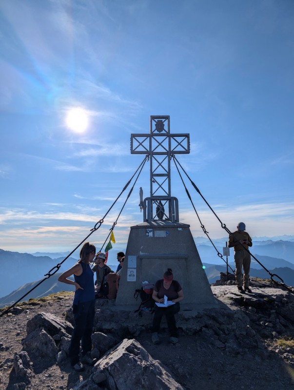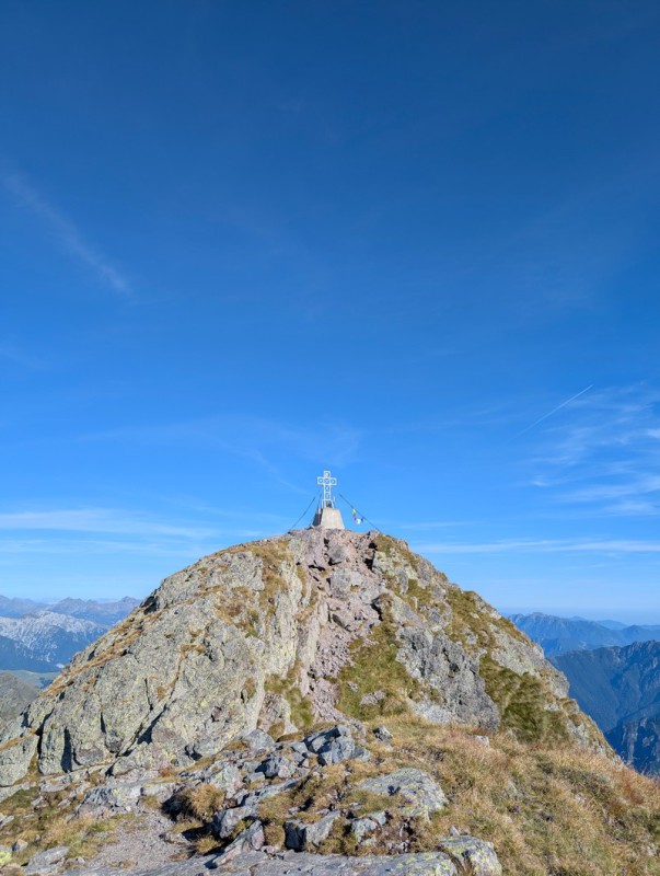 Dopo circa un'ora a passo medio, raggiungiamo la sommità della cresta di vetta del Pizzo Tre Signori. Affrontiamo adesso il caminetto, cioè uno stretto passaggio verticale tra due strette pareti rocciose (anche qui attrezzato con catene), all’uscita del quale ci ritroviamo nuovamente in cresta con un passaggio molto esposto con catene. Siamo arrivati all’anticima e davanti a noi, a breve distanza, vediamo la cima con la grande croce di vetta. Proseguiamo per pochi metri e infine eccoci arrivati (5 ore dalla partenza).