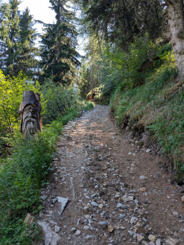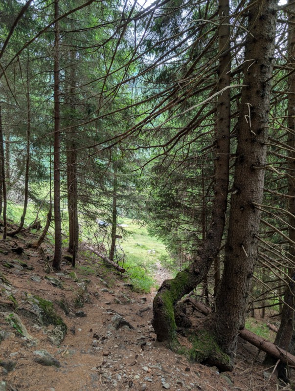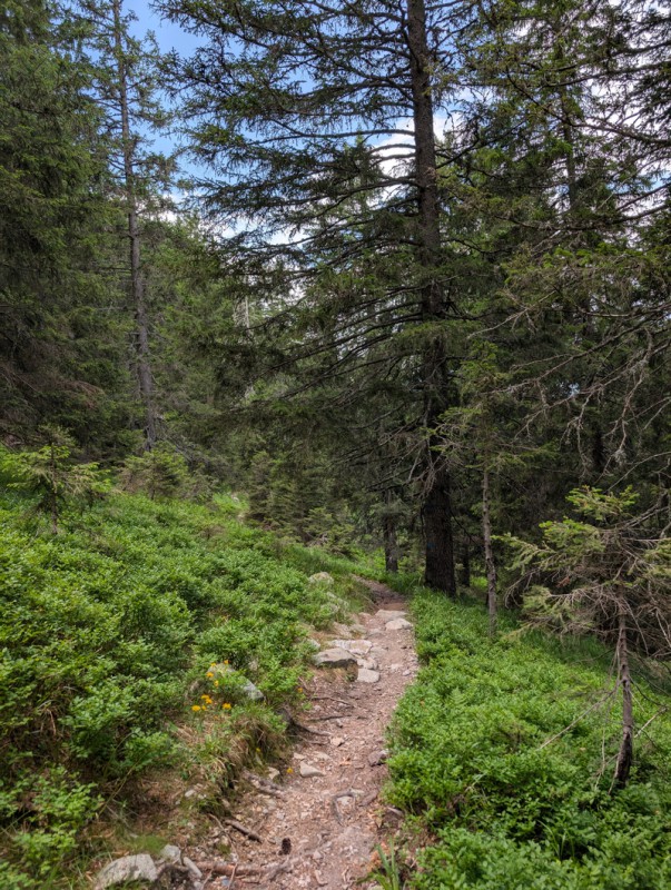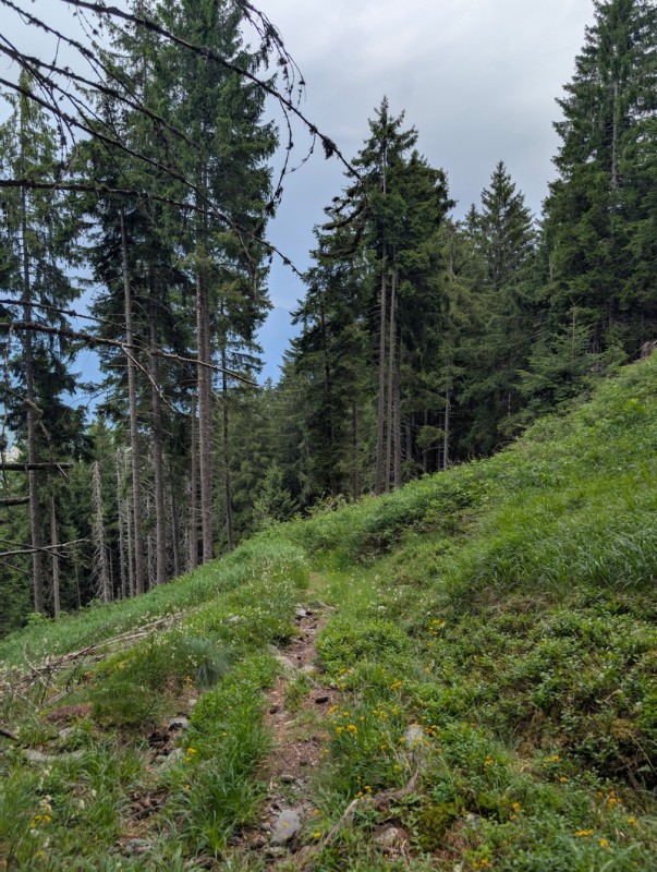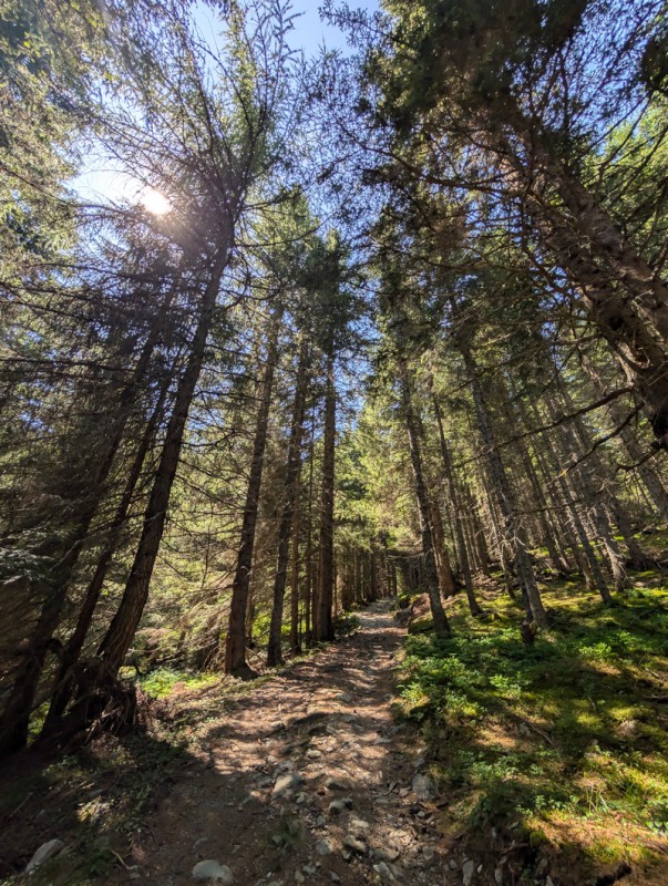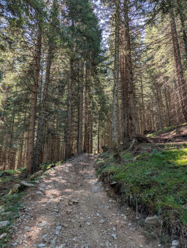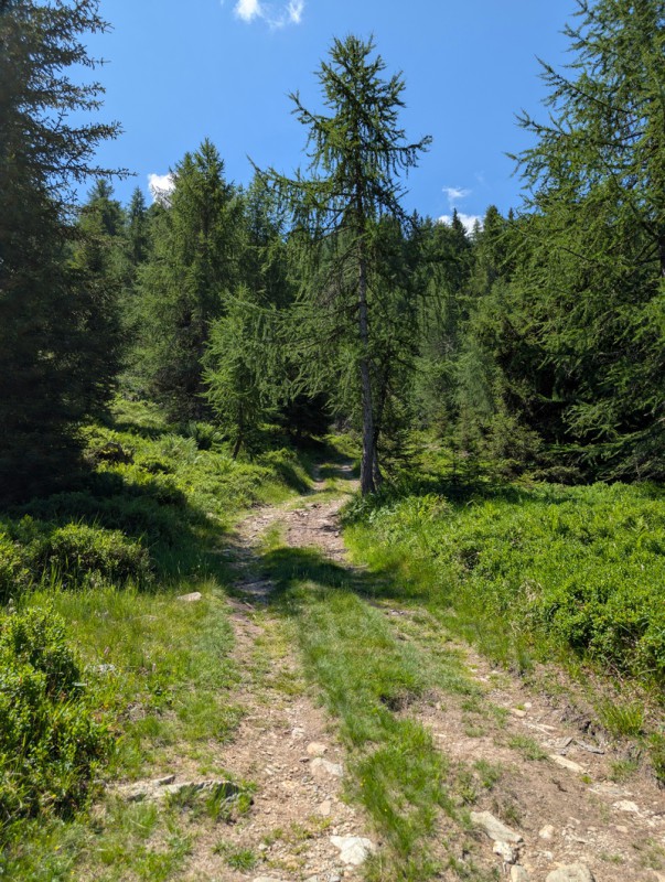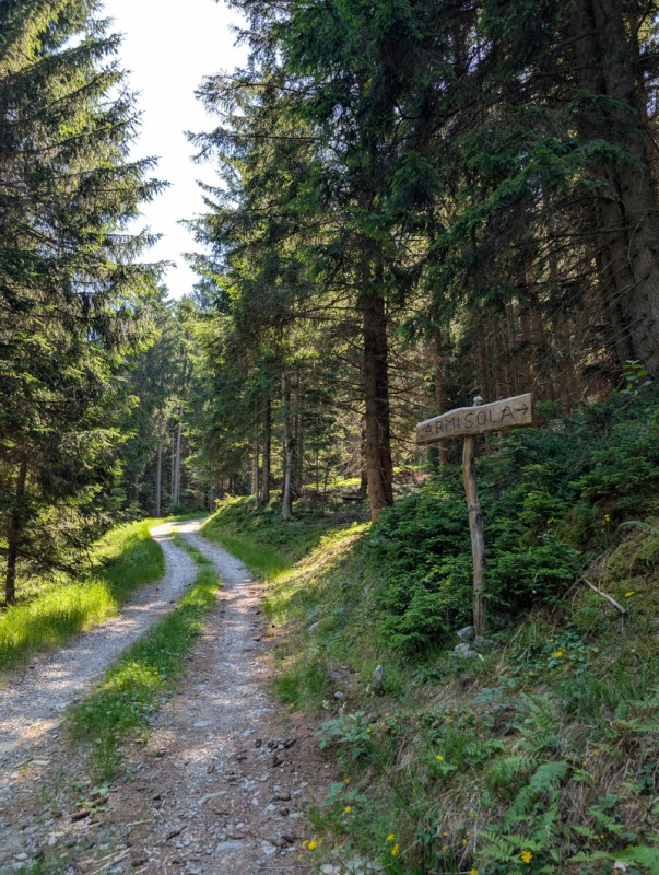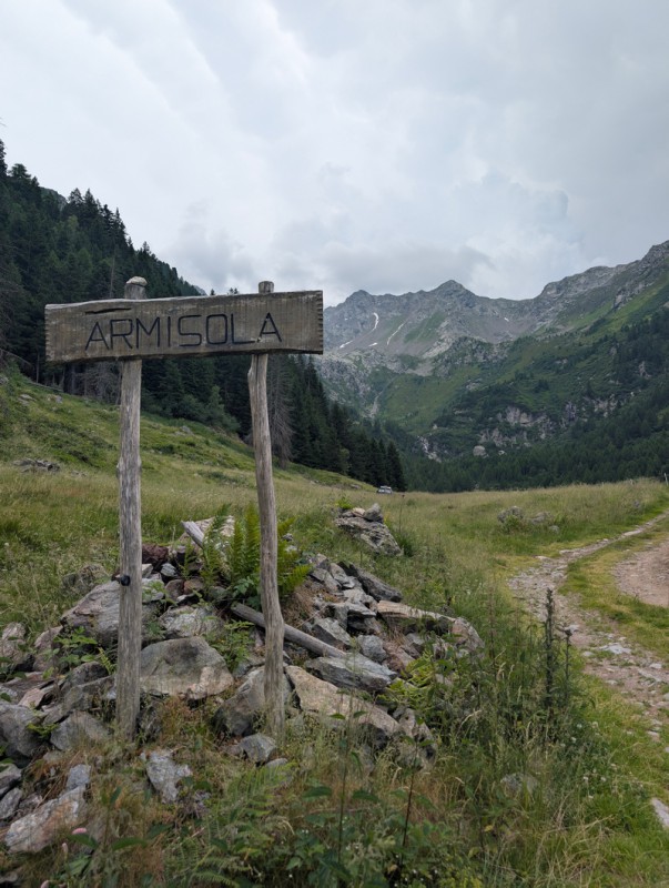 Seguiamo la strada agrosilvopastorale che sale con pendenze blande. Ignoriamo le prime deviazioni che troviamo, rimanendo sempre sulla strada. Dopo circa 30 minuti arriviamo a un bivio, dove troviamo un cartello in legno che indica la località Armisola. Lasciamo la strada e imbocchiamo il sentiero. Ora le pendenze sono un po’ più ripide, ma mai eccessive. Il sentiero si snoda in un bel bosco di conifere, non ci sono deviazioni ma dobbiamo prestare attenzione a rimanere sulla traccia principale e non farci trarre in inganno da tracce secondarie che non portano da nessuna parte.