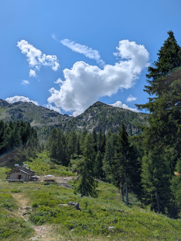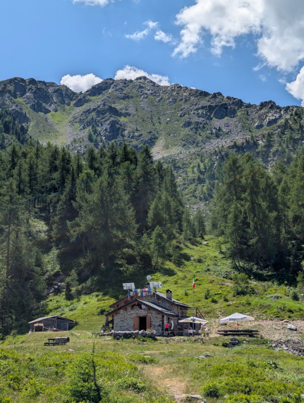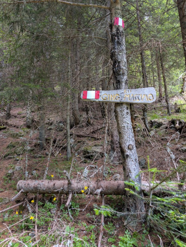 Proseguiamo il cammino. Qualche metro prima dell’alpeggio, a sinistra troviamo un sentiero. Seguiamo le indicazioni per il Rifugio Gino e Massimo / Grioni e imbocchiamolo. Anche questo tratto di sentiero si svolge in un bosco di conifere ed è molto bello. Le pendenze sono un pochino più sostenute, ma anche in questo caso niente di eccessivo. Rimaniamo sempre sul sentiero principale, finché non arriviamo proprio al rifugio (2 ore dalla partenza).