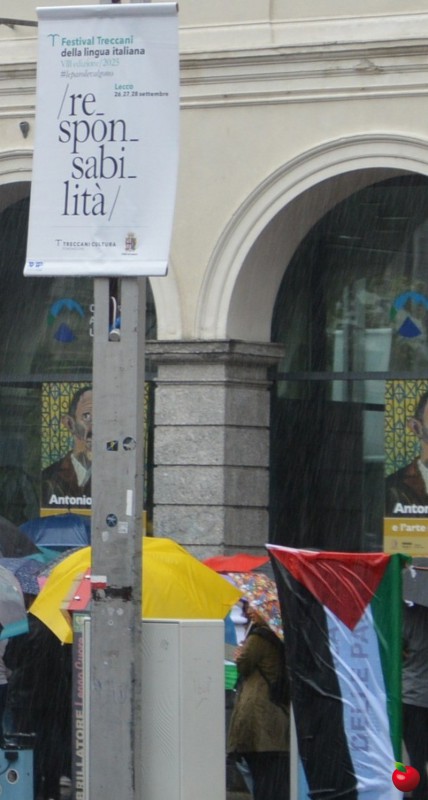 Presidio all’insegna dell’antisionismo quello promosso dal coordinamento lecchese “Stop al genocidio” e tenutosi questa mattina in piazza Garibaldi, nella giornata dello sciopero generale proclamato dai sindacati di base contro l'occupazione in corso a Gaza da parte dello Stato di Israele. Due ore di interventi a ruota libera sotto una pioggia battente che non ha comunque demoralizzato i manifestanti, circa due o trecento persone per la gran parte giovani, alcuni riparati sotto i portici o i tendoni dei bar.
