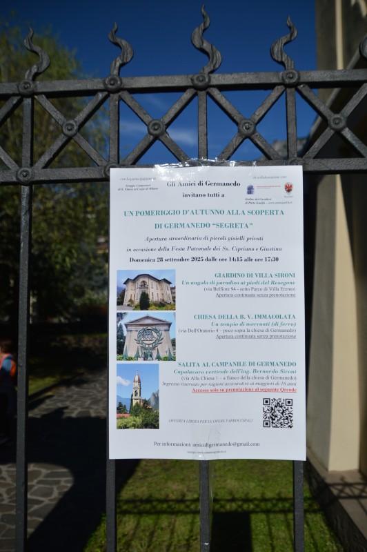 Un pomeriggio alla scoperta della “Germanedo segreta” nell’ambito delle iniziative per la festa patronale dei santi Cipriano e Giustina celebrata nella giornata di ieri, 28 settembre. Forse di segreti veri e propri non si può parlare, ma certamente l’occasione ha consentito di visitare qualcosa solitamente precluso al pubblico. E’ stato aperto l’oratorio privato della Beata Vergine Maria, è stato possibile salire sul campanile e anche passeggiare nel parco di Villa Sironi in via Belfiore.