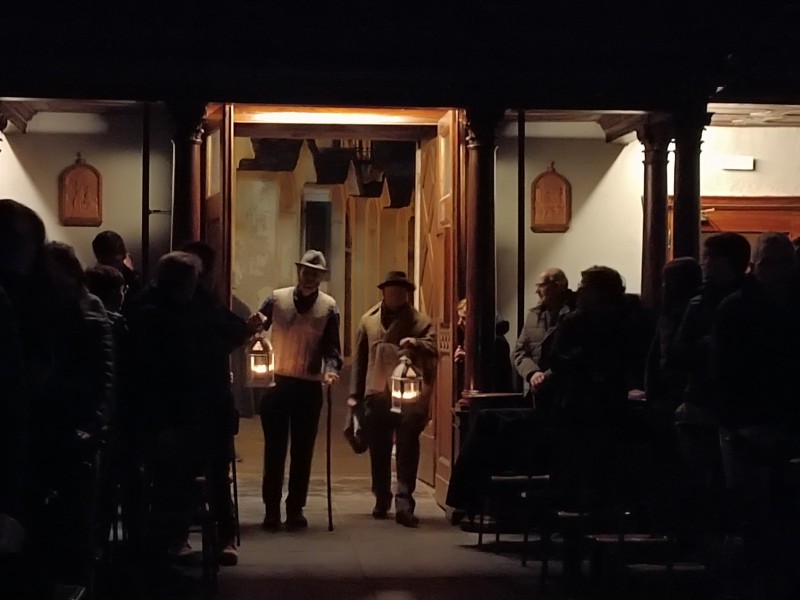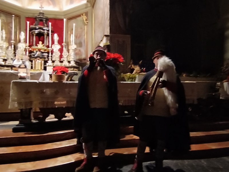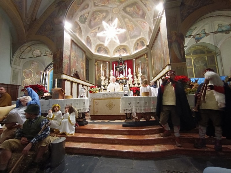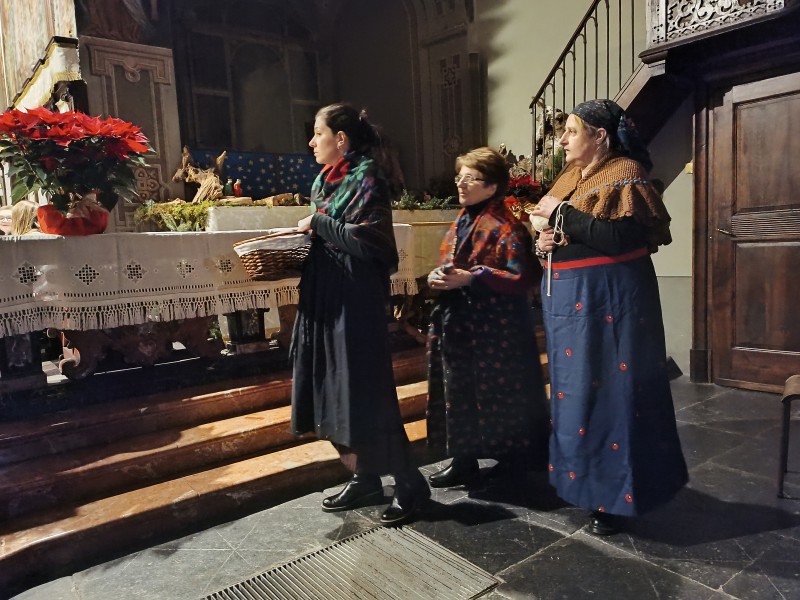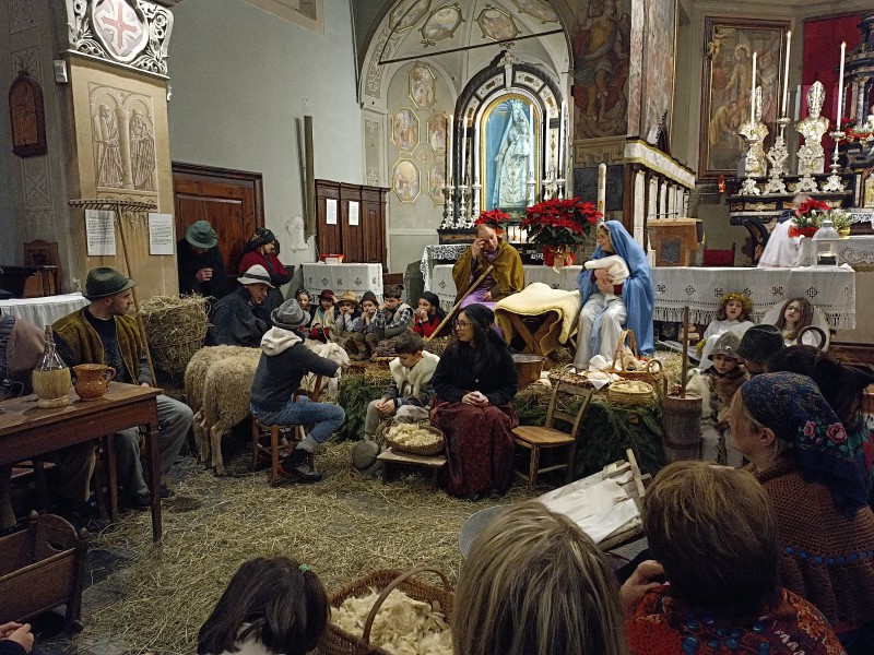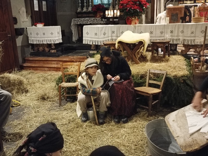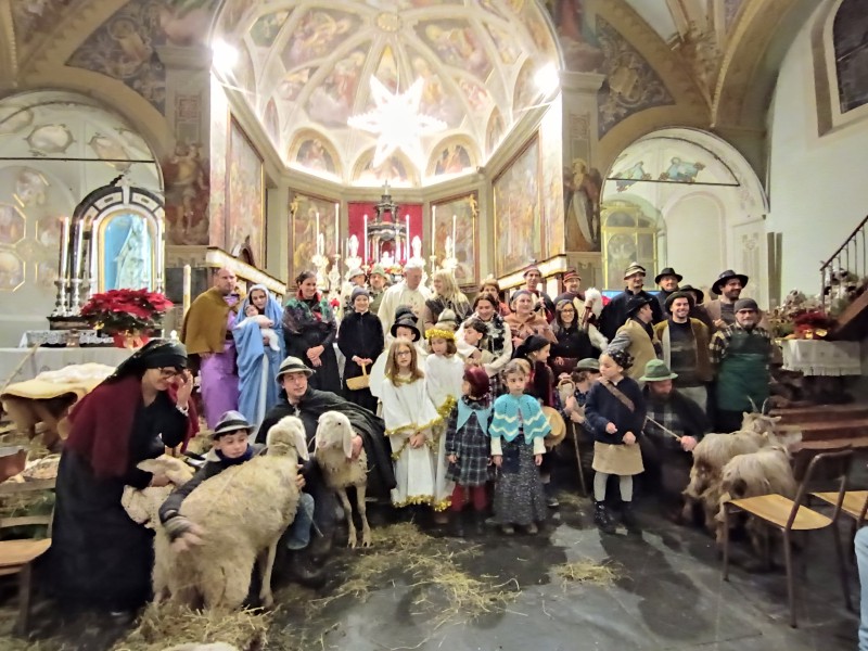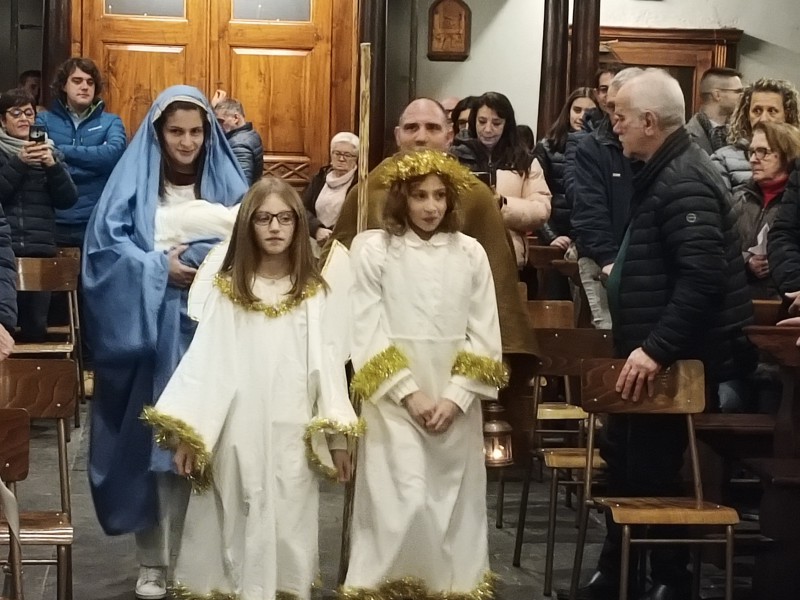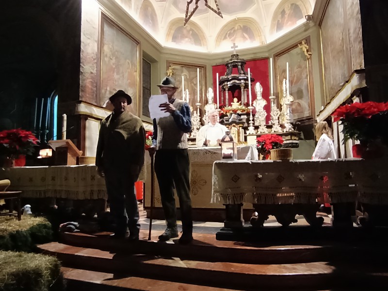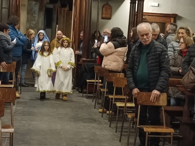 All'altare ad attendere tutti i figuranti c'era il parroco, don Bruno Maggioni, presto raggiunto da alcune donne che, come i pastori, cercavano "la Luce". Tra loro delle filatrici, distolte dai propri mestieri da quanto annunciato dall'Angelo. Perso posto di fronte ai guardiani delle pecore, hanno proseguito nel proprio lavoro. Subito dopo due zampognari hanno fatto il loro ingresso suonando "Tu scendi dalle stelle", accompagnando altri personaggi. Da ultimo l'arrivo di Gesù Bambino, tra le braccia della sua mamma, scortato da San Giuseppe e da due angeli.