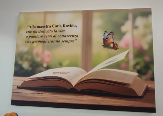 Dopo alcuni brevi interventi spontanei di ex colleghi, la cerimonia si è conclusa con il taglio del nastro e la scopertura della targa commemorativa, che recita: “Alla maestra Catia Rovida, che ha dedicato la vita a piantare semi di conoscenza che germoglieranno per sempre.”