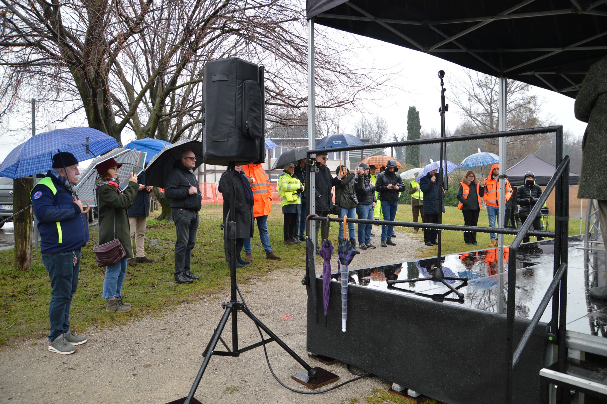L’inaugurazione è avvenuta sotto la pioggia che ha ridotto all’essenziale il programma, tanto che non c’è nemmeno stato il rituale taglio del nastro.